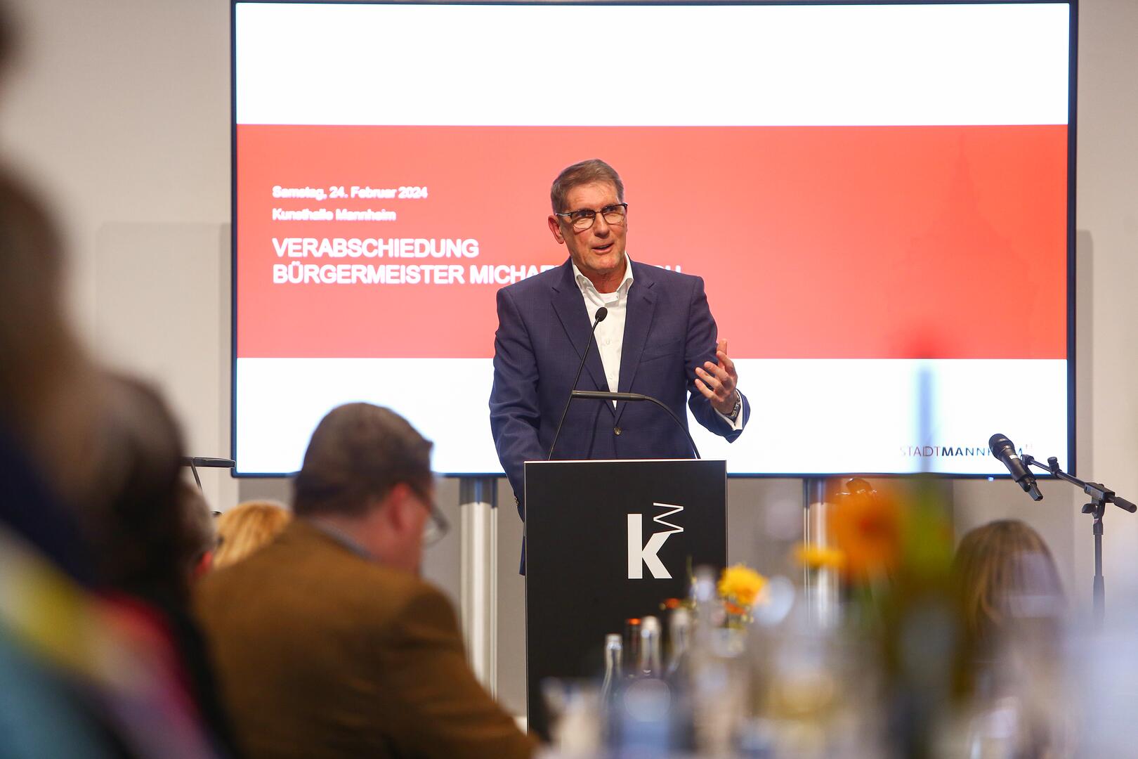 Michael Grötsch, Bürgermeister für Wirtschaft, Arbeit, Soziales und Kultur, wurde am Samstagabend – wenige Tage vor dem offiziellen Ende seiner zweiten Amtszeit – feierlich verabschiedet. Rund 240 Gäste folgten der Einladung in das Atrium der Kunsthalle Mannheim zu einer bewegenden und stimmungsvollen Veranstaltung, dessen musikalischer Rahmen das Bläserquintett und der Opernchor des Nationaltheaters sowie die Band Braveland gestalteten.
