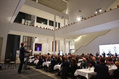 Professor Dr. Ulrich Nieß, den Moderatorin Isabel Fienhold als personifiziertes Gedächtnis der Stadt vorstellte, war Laudator des Abends. Kurzweilig, charmant und geistreich komplettierte der langjährige Leiter des Stadtarchivs – heute Marchivum – die Ausführungen des Oberbürgermeisters und gab Einblicke in das Zusammenwirken hinter den Rathaus-Mauern „Am Beispiel des Zusammenspiels von Dr. Kurz und Herrn Grötsch kann man wundervoll erkennen, wie über Parteigrenzen hinweg, gemeinsam an Strategie, Zielen und Maßnahmen gearbeitet wurde, um gemeinsam etwas zu bewegen.“ Doch er räumte auch ein, dass Grötsch für das Nationaltheater brenne und es ihm vermutlich schwer falle, mitten in der Bauphase den Stab übergeben zu müssen. „Das zeigt, wie sehr er in Mannheim angekommen ist, das Mannheim Gen verinnerlicht hat“, so Nieß.