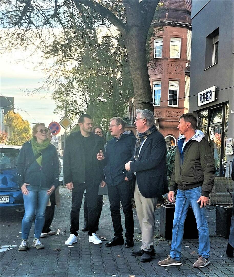 Im Anschluss daran führte der Rundgang zur Feudenheimer Hauptstraße, wo die örtliche Nahversorgung im Fokus stand. Während des ausführlichen Austauschs in der Metzgerei Trautmann und der Buchhandlung Waldkirch wurden die Belange kleinstrukturierter Betriebe deutlich. Besonders wichtig sei eine Vielfalt an Geschäften und gemeinsamen Aktionen, die den Stadtteil beleben und diesen attraktiv halten, brachten Barbara Waldkirch („Wir sind ein niederschwelliges soziales Angebot. Wir brauchen Aktivitäten.“) und Horst Trautmann („Die Einkaufsstraße darf nicht erodieren. Wir müssen die Leute auf die Gass‘ bringen) zum Ausdruck. Bürgermeister Riehle unterstützte das Ansinnen, verwies aber auch auf die Verantwortung der Immobilieneigentümer bei Neuvermietungen.