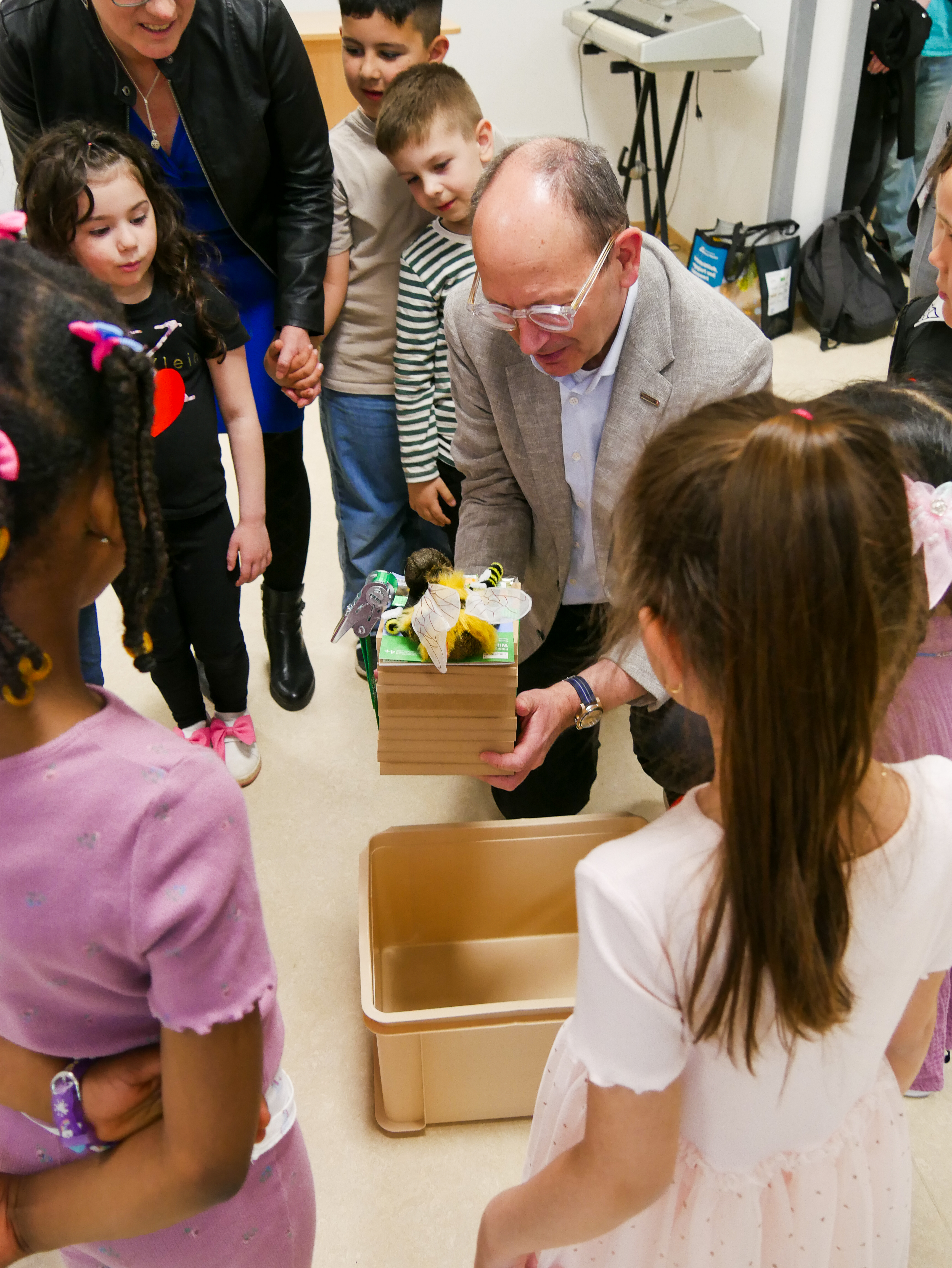 Zum Abschluss überreichte Oberbürgermeister Specht der Einrichtungsleitung ein besonderes Geschenk: ein Bienenzucht-Set. Damit können die Kinder den Lebensraum und die Entwicklung der (ungefährlichen) Roten Mauerbiene hautnah erleben – und spielerisch ein Bewusstsein für Natur, Nachhaltigkeit und Biodiversität entwickeln.