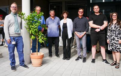 Als Symbol für die wachsende und im Stadtteil verwurzelte offene Jugendarbeit überreichten die Bürgermeister Dirk Grunert und Ralf Eisenhauer dem Team des Jugendtreffs ein kleines Zitronenbäumchen, das in der Einrichtung ein neues Zuhause finden soll.