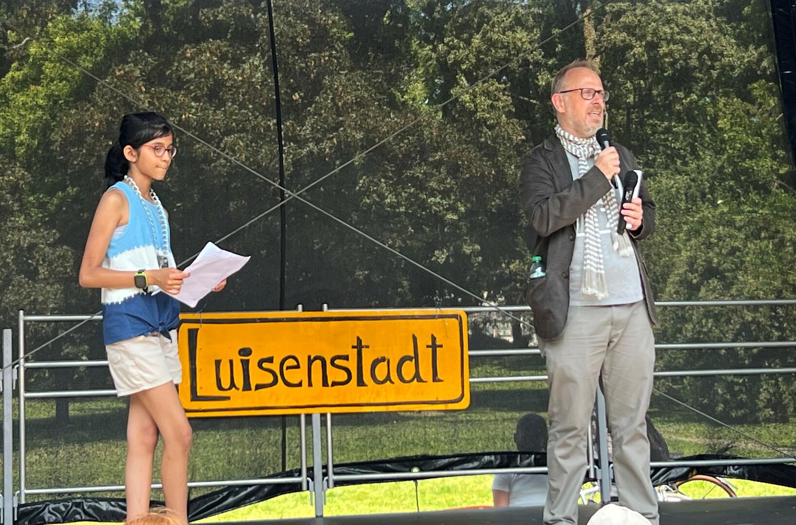 Am „Tag der offenen Tür“ zeigte sich auch die „Luisenstadt“-Bürgermeisterin auf der Bühne: Die 12-jährige Shubhangi, Schülerin am Mollgymnasium, war in der ersten Woche der Spielaktion bei von den Kindern organisierten Wahlen gewählt worden. Sie hatte sich dabei gegen neun Mitbewerber*innen durchgesetzt. Für ihre Amtszeit waren ihr die Themen Sauberkeit, Sicherheit und ein erschwinglicheres Leben in der „Luisenstadt“ wichtige Anliegen. Unterstützt wurde sie dabei von einem engagierten Stadtrat, bestehend aus Aaron, Melina, Malek und Elyas.
