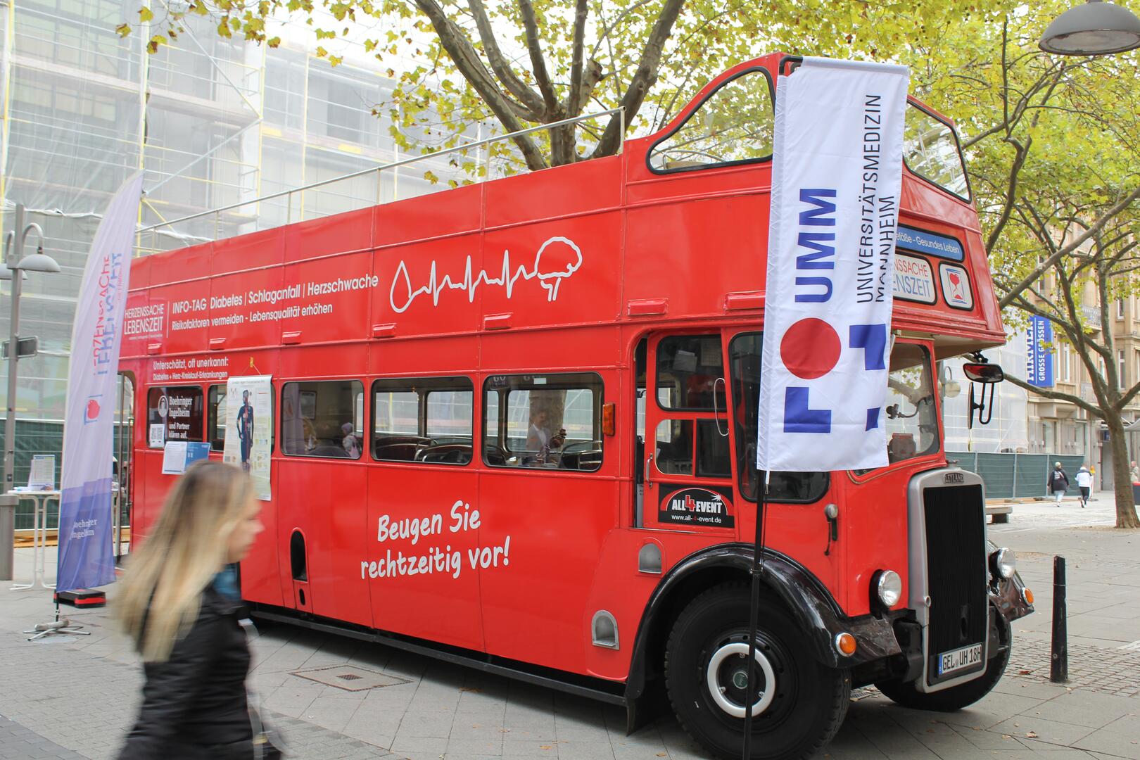 Mit Schnelltests können Besucherinnen und Besucher im Doppeldecker-Bus Hinweise auf ihr persönliches Risiko für eine Herzschwäche, einen Schlaganfall oder Diabetes mellitus erhalten. Unter anderem ermitteln Ärztinnen, Ärzte und Pflegekräfte des UMM-Teams direkt vor Ort kostenfrei den Blutzuckerspiegel, den Blutdruck, bestimmte Schlaganfall-Risiko-Werte oder Anzeichen für Herzrhythmusstörungen wie Vorhofflimmern. Die erfahrenen Medizinerinnen und Mediziner ordnen die Messergebnisse mit den Besucherinnen und Besucher ein und geben Tipps, wie sich ein Erkrankungsrisiko positiv beeinflussen lässt.