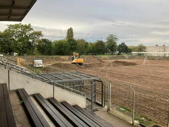 Die Bauarbeiten hierfür haben begonnen. Etwa 50 Prozent des Spielfeldes sind bereits abgeschoben – bislang wurden bereits mehr als 2.500 Tonnen Erdmasse bewegt. Der Fachbereich Sport und Freizeit investiert knapp 700.000 Euro. Für die Sanierung der Rasenfläche wird eine Ansaat mit vorgekeimten Gräsern zur rascheren und dichteren Rasenentwicklung verwendet.