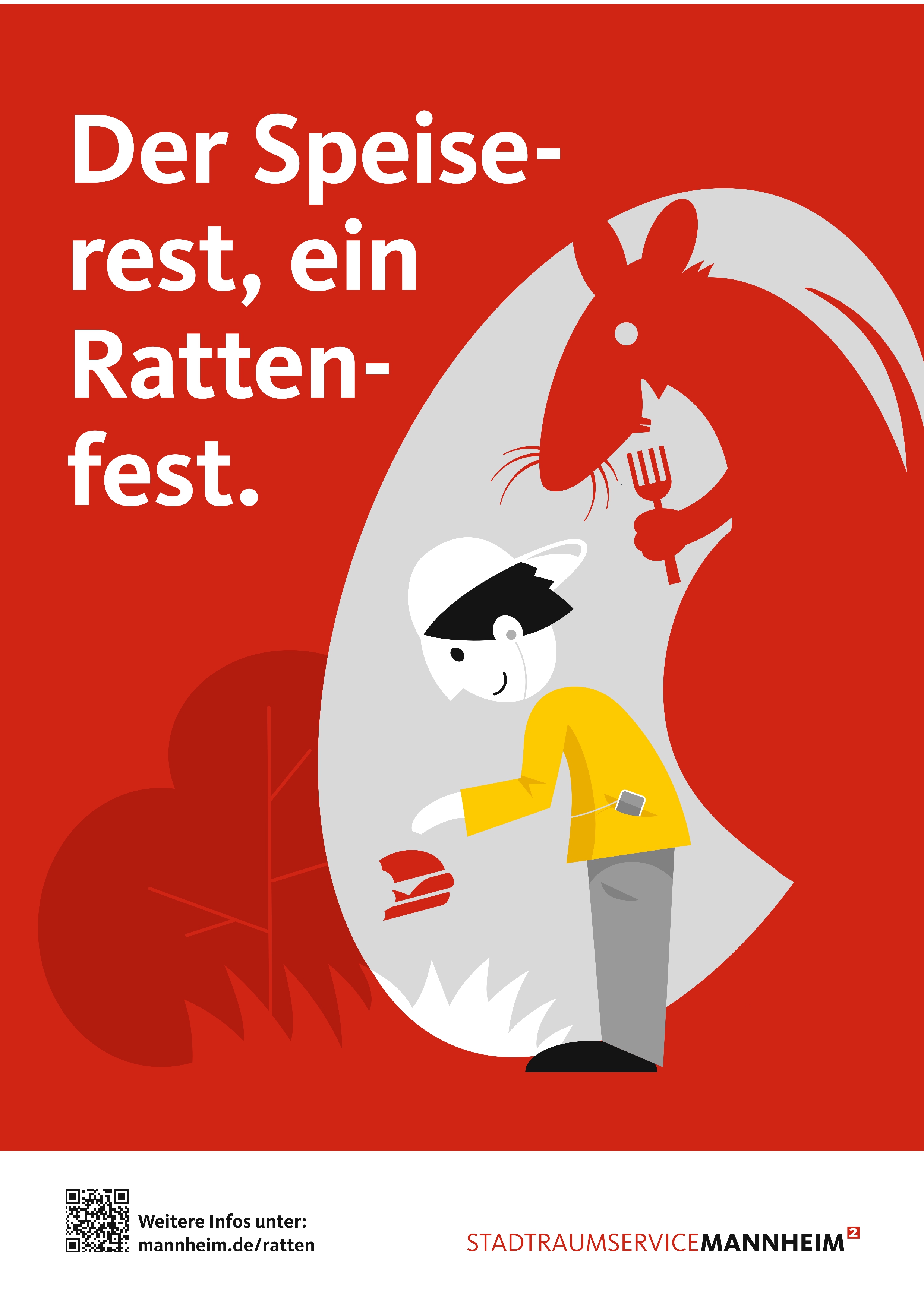 Um darüber zu informieren, dass das Verhalten im öffentlichen Raum die Ausbreitung von Ratten beeinflusst, hat der Stadtraumservice eine Plakatkampagne im öffentlichen Raum und an Hot-Spots gestartet. Die Motive erinnern mit humorvollen Motiven daran, was man selbst tun kann. Ergänzend wird online darüber informiert, welche Vorsichtsmaßnahmen getroffen werden können, um das Ausbreiten der Ratten zu verhindern. Die Informationen findet man auf www.mannheim.de/ratten.