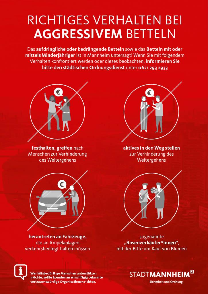 Laut Allgemeiner Polizeiverordnung der Stadt Mannheim ist aufdringliches oder bedrängendes Betteln verboten. Dies umfasst auch das Herantreten an Fahrzeuge im fließenden oder ruhenden Verkehr. Der städtische Ordnungsdienst ist regelmäßig in der Innenstadt unterwegs, spricht Platzverweise aus und ahndet Verstöße, die mit Bußgeldern von bis zu 150 Euro geahndet werden können.