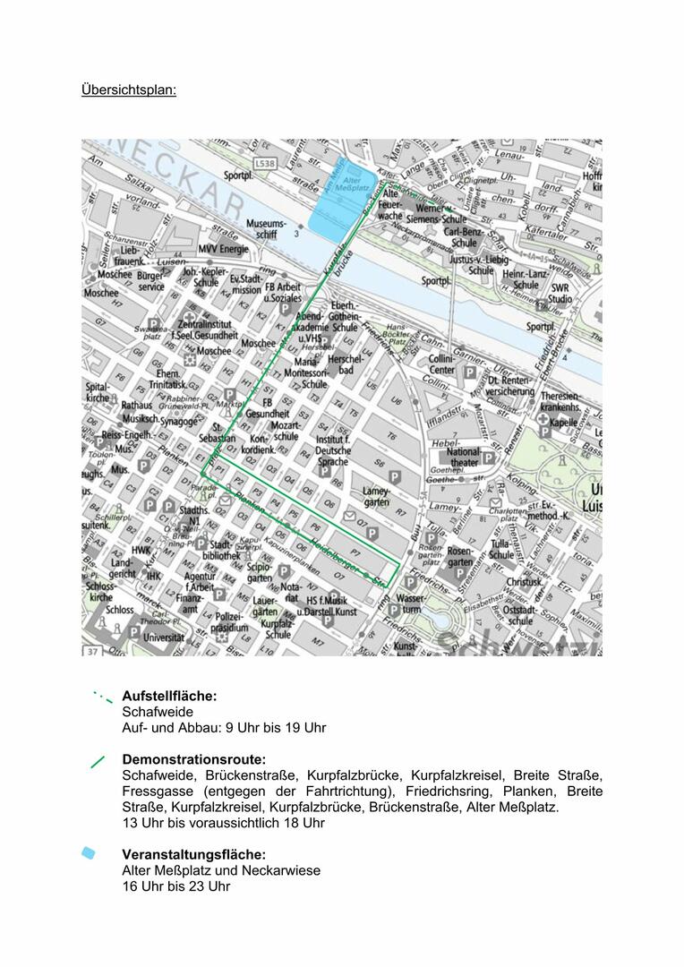 Die Demonstrationsteilnehmer sammeln sich ab 10 Uhr in der Schafweide. Die Demonstration startet dann um 13 Uhr von der Schafweide und führt über die Brückenstraße, Kurpfalzbrücke, Kurpfalzkreisel, Breite Straße, Fressgasse (entgegen der Fahrtrichtung), Friedrichsring, Planken und über die Breite Straße zurück zum Alten Messplatz.