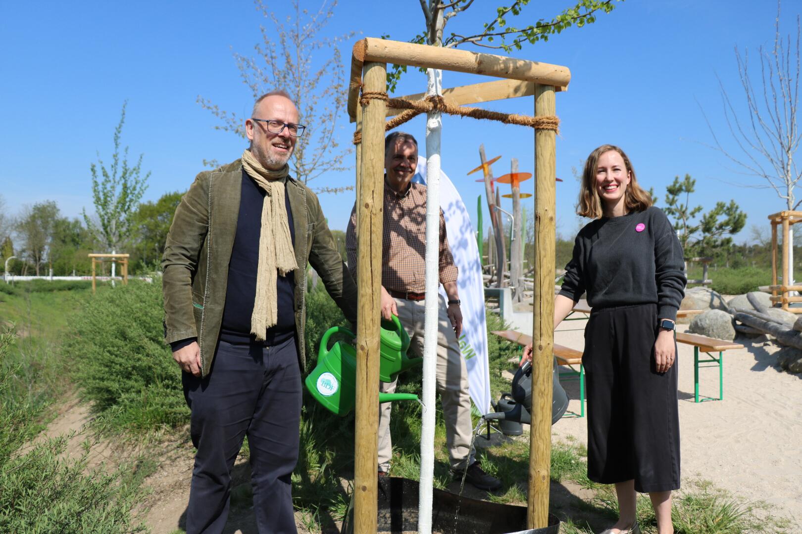Ebenfalls am 18. April trafen sich Bürgermeister Dirk Grunert, Sebastian Eick, Vorsitzender der Schutzgemeinschaft Deutscher Wald (SDW) Mannheim, und Alexandra Jöst-Handlos vom Bürgerverein MeinFranklin auf dem inklusiven Spielplatz Stadtdüne, um zwei Zitterpappeln anzugießen. Während sich die Kinder über den zusätzlichen Schatten auf dem Spielplatz freuten, feierten die Mitglieder des Bürgervereins den Tag des Baumes bei Kaffee und Kuchen.