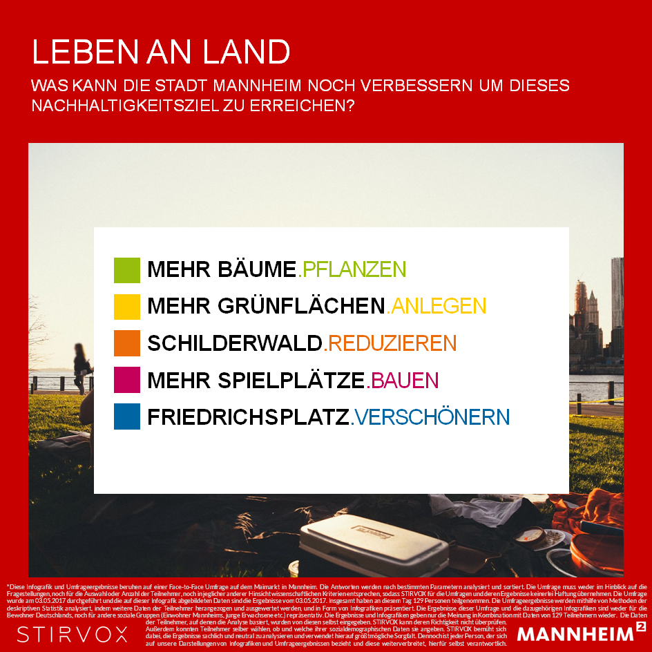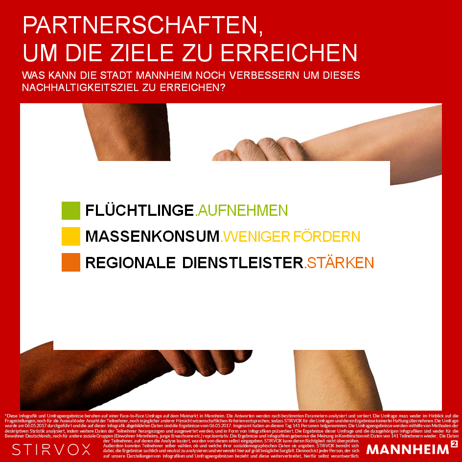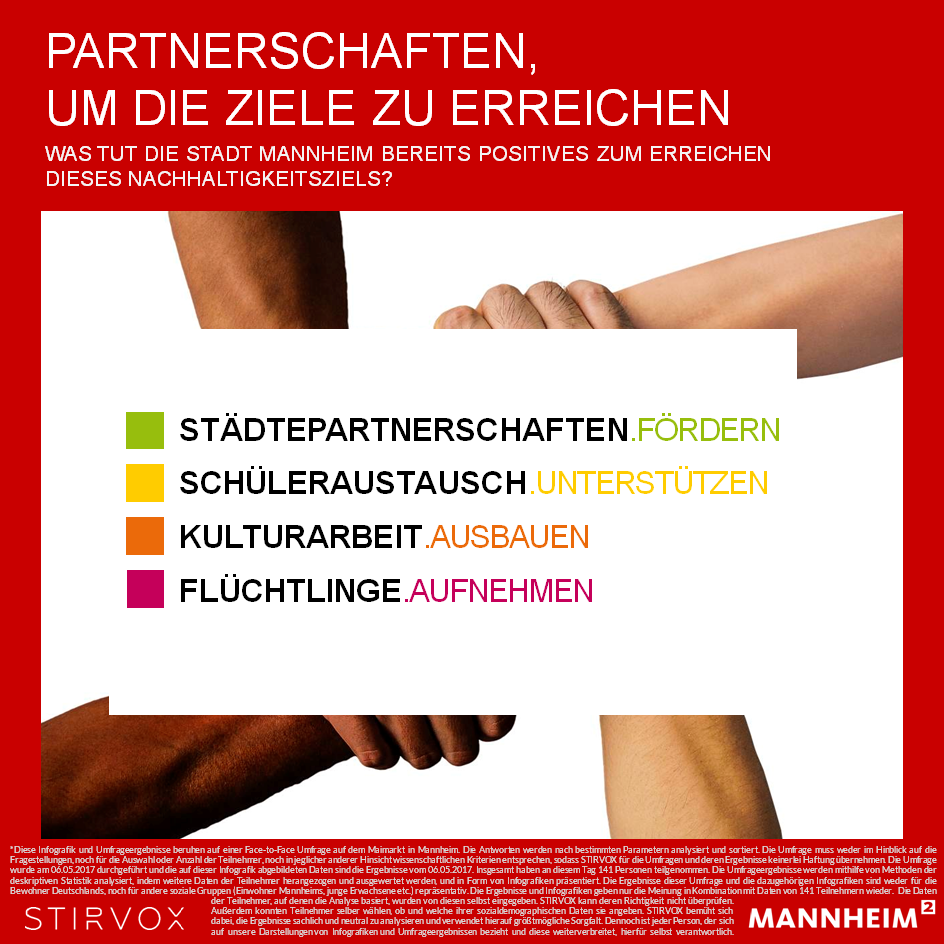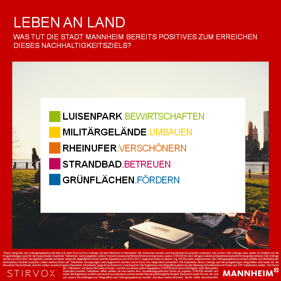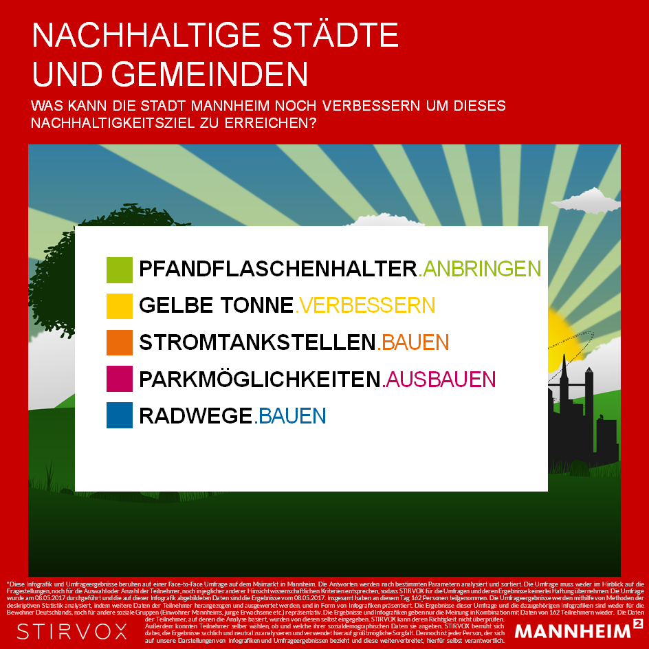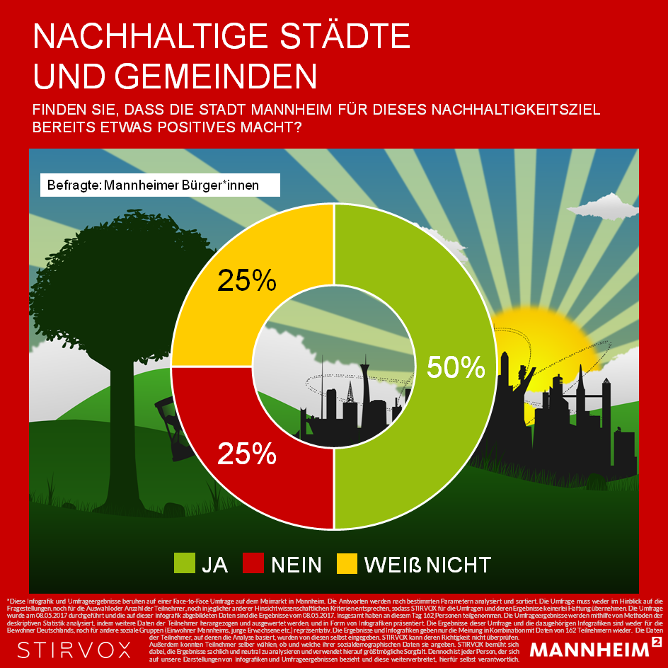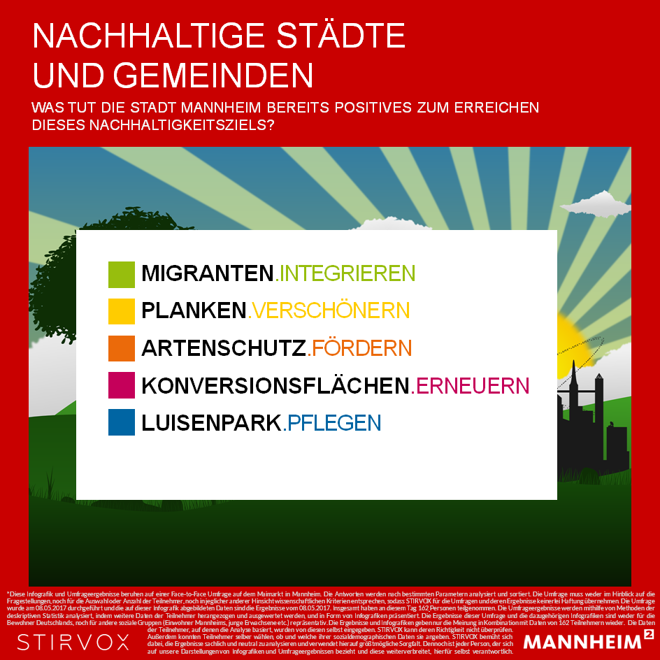Eine täglich auf dem Maimarktgelände stattfindende Tablet-Umfrage zur Agenda 2030 sowie eine Postkartenumfrage und ein Gewinnspiel zu den Sustainable Development Goals am Stand machten das Themenfeld Nachhaltigkeit zum zentralen Gesprächsgegenstand. Die täglichen Interviews mit Expertinnen und Experten aus der Verwaltung und deren externen Umfeld beleuchteten diverse Nachhaltigkeitsfacetten einer Stadt, darunter den Klimaschutz, die öffentliche Beschaffung, das Grün in der Stadt und auch neue Formen des Wohnens und Zusammenlebens.