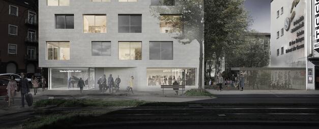 Die Räume im Erdgeschoss öffnen sich zur Meerfeldstraße hin mit großzügigen Fenstern, welche sich im Sommer weitestgehend öffnen lassen und so eine Anbindung zur Freifläche und somit ins Quartier, ermöglichen.