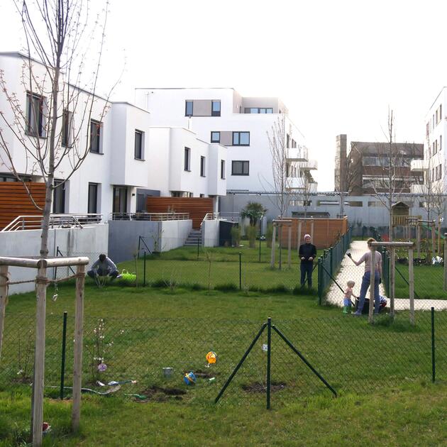 Unter dem Motto "dörfliches Wohnen im Doppel- und Hofhaus" entstand im Auftrag der städtischen Wohnungsbaugesellschaft GBG am Bischweiler Ring ein neues Wohnquartier in unmittelbarer Nähe von Schule und Kindergärten. Neben 16 Doppelhaushälften und einem Einfamilienhaus wurden moderne, barrierearme Mehrfamilienhäuser entwickelt.