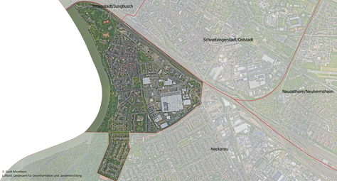 • Größe ca. 2,3 km² - entspricht etwa 330 Fußballfeldern und macht etwa 1,6 Prozent der Gesamtfläche Mannheims aus. 60 Prozent der Fläche des Stadtteils sind versiegelt.