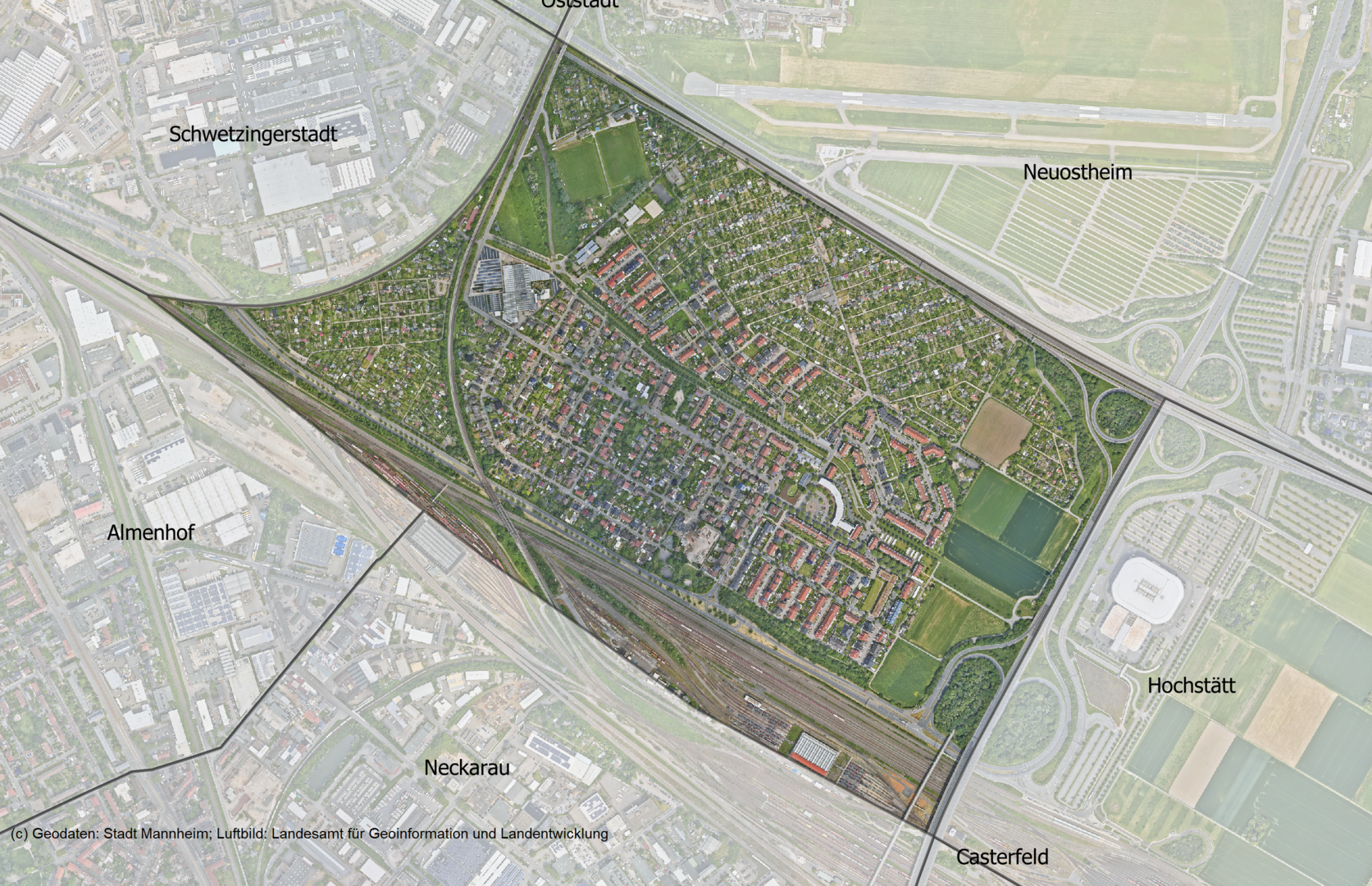 - Größe ca. 1,4 km² - entspricht etwa 210 Fußballfeldern und macht etwa 1 Prozent der Gesamtfläche Mannheims aus. 49 Prozent der Fläche des Stadtteils sind versiegelt.