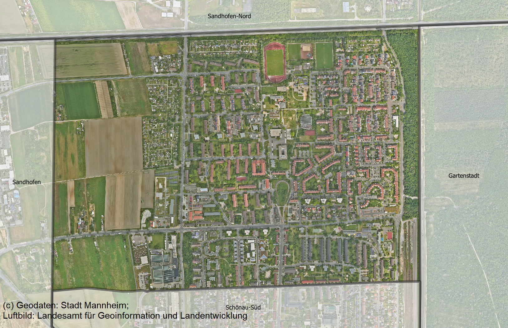 - Größe ca. 1,7 km² - entspricht etwa 340 Fußballfeldern und macht etwa 1,2 Prozent der Gesamtfläche Mannheims aus. 44 Prozent der Fläche des Stadtteils sind versiegelt.