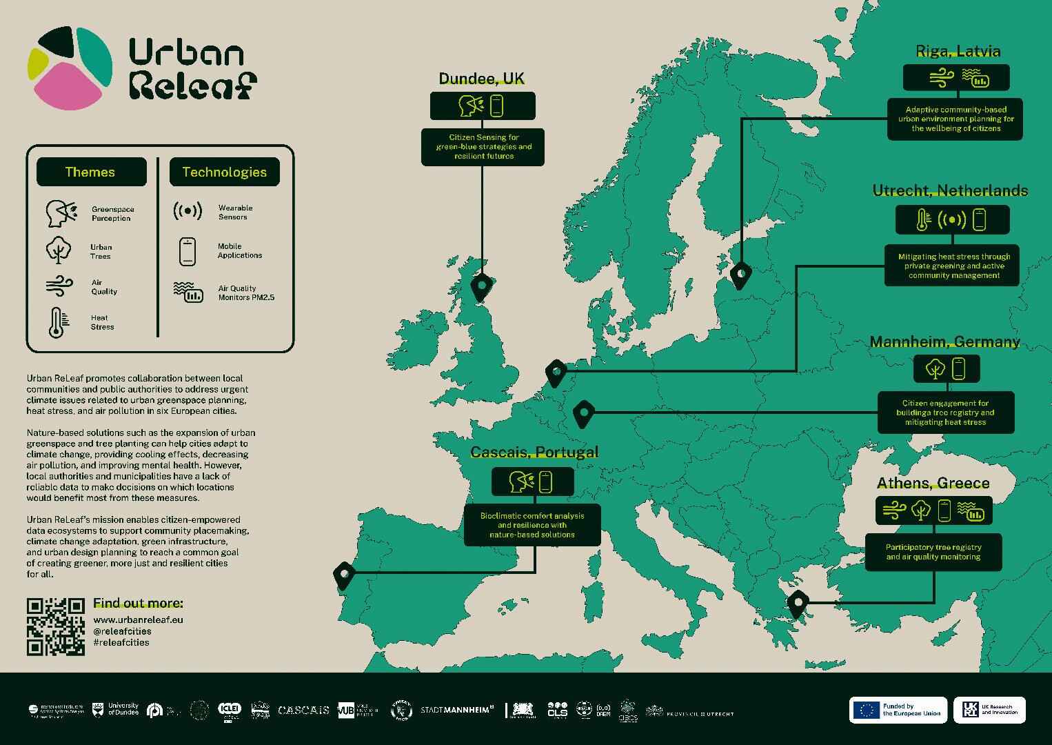 Im Zentrum des Innovationsansatzes von Urban ReLeaf stehen Behörden, Organisationen und Bürgergruppen in sechs europäischen Pilostädten: Athen (Griechenland), Dundee (Schottland), Utrecht (Niederlande), Cascais (Portugal), Riga (Lettland) und Mannheim. Die Innovationsbemühungen des öffentlichen Sektors werden durch Mitgestaltungsmaßnahmen, Bürgerbeteiligung und Technologien zur Unterstützung von Bürgerbeobachtungen gestärkt.