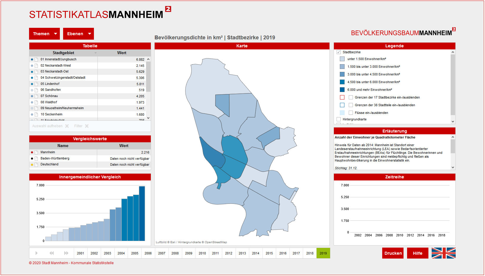 Der StatistikatlasMannheim² bietet die Möglichkeit, verschiedene kommunalstatistische Daten für verschiedene städtische Teilgebiete und verschiedene Beobachtungsjahre selbständig abzurufen.