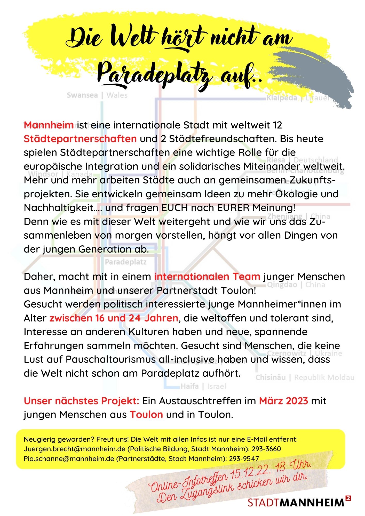 - Gemeinsames Jugendprojekt #keepitclean zwischen Mannheim und Toulon zum Thema Umweltschutz