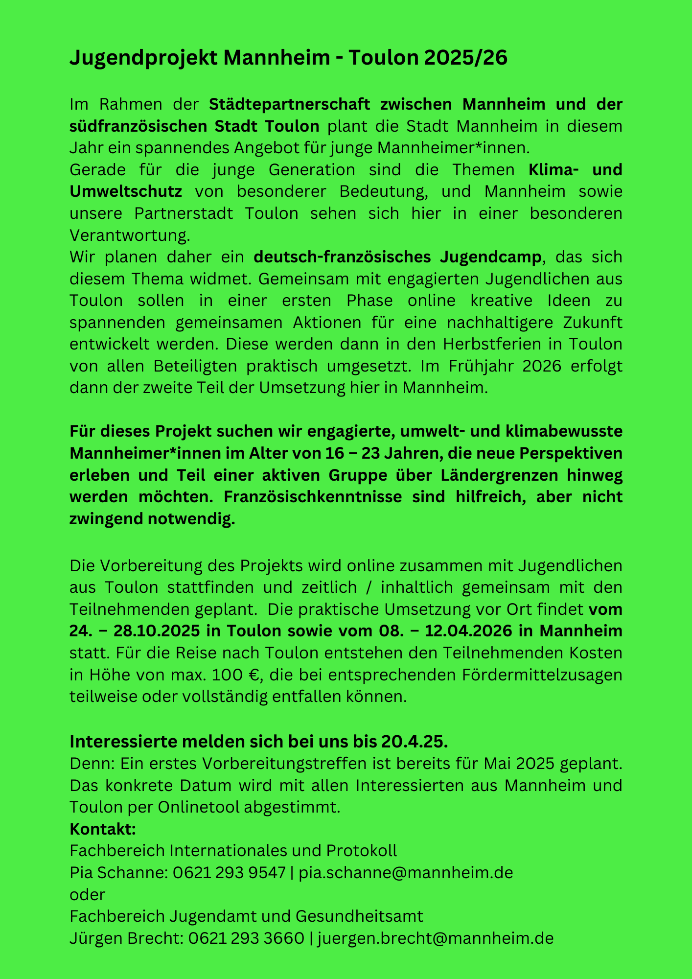 Interessierte sind immer herzlich willkommen. Bringe dich mit deinen Ideen ein und melde dich bei uns! Junge Menschen zwischen 16 und 25 Jahren können an den Jugendbegegnungsprojekten mit unserer Partnerstadt Toulon teilnehmen.