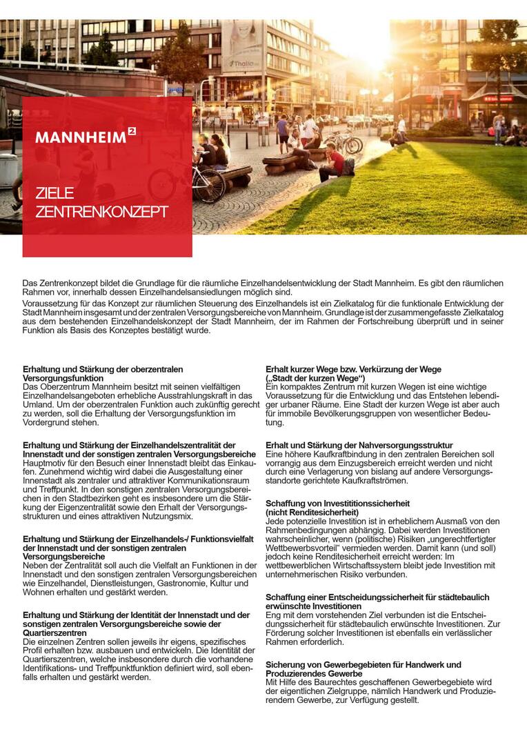Für das Zentrenkonzept erfolgte u.a. die flächendeckende Erhebung des Einzelhandelsangebotes, eine städtebaulich-funktionale Bestandsaufnahme, die Abgrenzung der Einzelhandelszentren, welche auch zentrale Versorgungsbereiche genannt werden, eine Analyse und Bewertung der Nahversorgungssituation in den Stadtteilen, die Überprüfung der Zentrentypisierung und die Aufstellung einer speziell für Mannheim gültigen Sortimentsliste der zentrenrelevanten und nicht-zentrenrelevanten Sortimente.