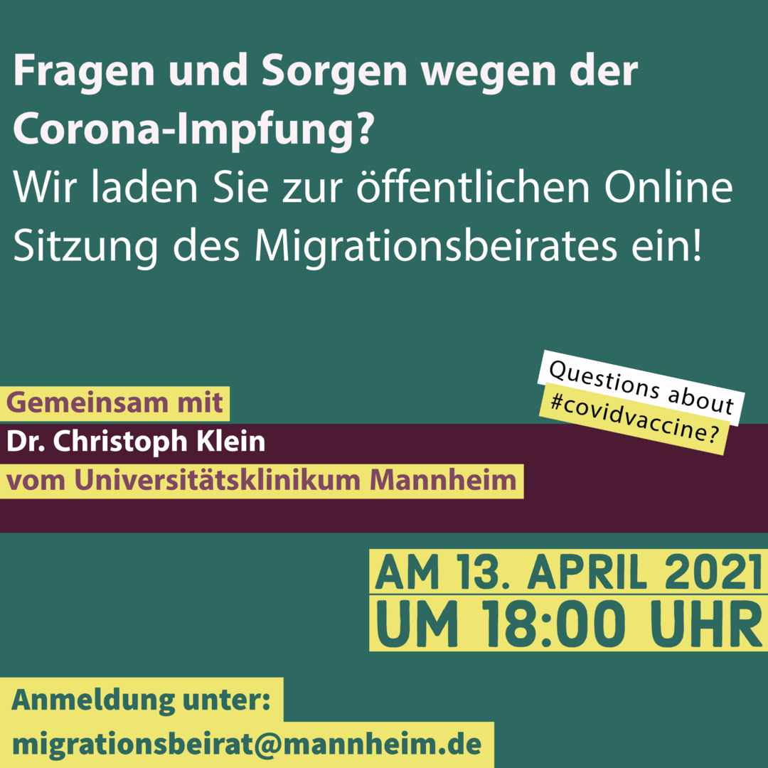 Wie immer besteht dann im letzten Sitzungsteil für alle Gäste die Gelegenheit, eigene Anregungen und Anliegen mitzuteilen. Wenn Sie Interesse haben, an der Sitzung teilzunehmen, so bitten wir Sie um Anmeldung unter migrationsbeirat@mannheim.de. Sie erhalten dann rechtzeitig den Link, mit dem Sie der Sitzung beitreten können.