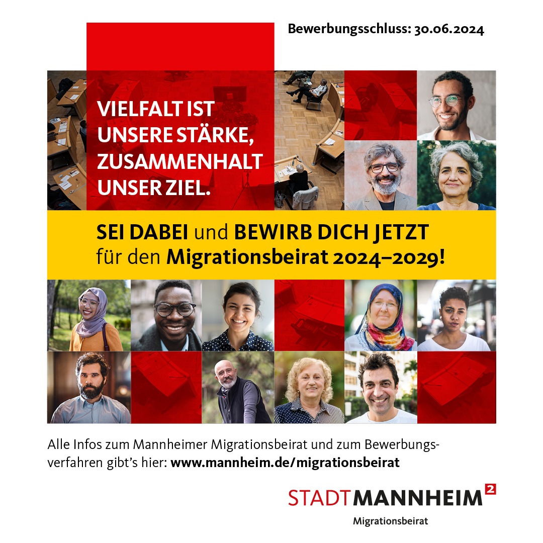 Ende 2024/Anfang 2025 wird der Mannheimer Migrationsbeirat zum vierten Mal neu berufen. Alle Mannheimer*innen mit Migrationsbiografie, die interessiert daran sind, die kommunale Integrationspolitik aktiv mitzugestalten und die dabei ihre spezifischen Erfahrungen und Expertise einbringen möchten, hatten die Möglichkeit, sich vom 1. März bis zum 30. Juni 2024 für die neue Amtszeit 2024-2029 bewerben. Eine eigens hierfür eingesetzte Berufungskommission wird im Herbst über die Zusammensetzung des neuen Migrationsbeirates entscheiden. Das Verfahren wird voraussichtlich Ende des Jahres abgeschlossen sein und der neue Migrationsbeirat im Anschluss vom Gemeinderat offiziell in sein Amt berufen werden. Nähere Informationen zum Berufungsverfahren finden Sie hier.