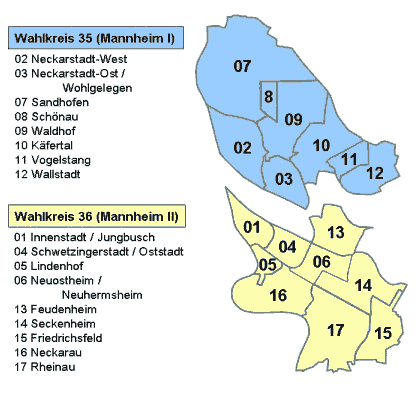 Baden-Württemberg ist für die Landtagswahl in 70 Wahlkreise eingeteilt. Die Stadt Mannheim nimmt zwei dieser Wahlkreise ein: 35 Mannheim 1 (Käfertal, Neckarstadt-West, Neckarstadt-Ost/Wohlgelegen, Sandhofen, Schönau, Waldhof, Vogelstang und Wallstadt) und 36 Mannheim 2 (Feudenheim, Friedrichsfeld, Innenstadt/Jungbusch, Lindenhof, Neckarau, Neuostheim/Neuhermsheim, Rheinau, Schwetzinger-/Oststadt, und Seckenheim).