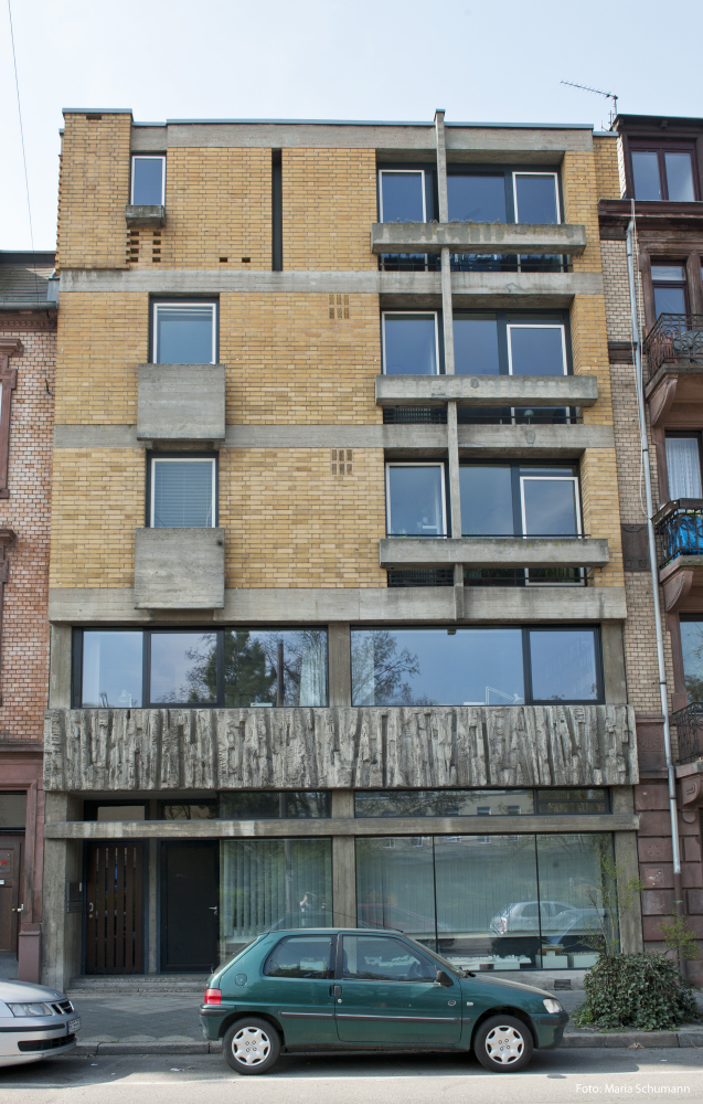 Carlfried Mutschler gehörte zu jenen Eiermann-Schülern, die innerhalb der vielfach phantasielosen Mannheimer Nachkriegsarchitektur schon früh durch qualitätsvolle Bauwerke auffielen. Eines dieser Gebäude ist das in eine Hauszeile des 19. Jahrhunderts eingefügte Wohn- und Atelierhaus des Architekten. Das Haus, mit dem sich Mutschler vom Funktionalismus Eiermannscher Prägung verabschiedete, wurde in einer Baulücke errichtet, die durch ihre geringe Breite eine straffe Raumorganisation notwendig machte. So erschließt ein schmales seitlich angeordnetes Treppenhaus die fünf Geschosse, dessen oberstes als Wohnung dient und über eine an der Rückfassade auskragende Wendeltreppe mit einer Dachterrasse verbunden ist. Das Flachdach, die Geschoßhöhen und die Fassadengestaltung setzen den Neubau in Kontrast zu den flankierenden Altbauten. EG und 1. OG sind verglast und durch eine Brüstung mit einem abstrakten, kraftvollstrukturierten Betonrelief des Stuttgarter Künstlers Otto Herbert Hajek betont. Gelber Klinker über dem 1. OG sucht die Anbindung an die Nachbarhäuser; Sichtbetongliederungen und –flächen schaffen moderne Akzente. Die Kombination von rechteckigen Flächen und Wandscheiben sowie horizontalen und vertikalen Gliederungselementen gibt der Fassade den Charakter einer abstrakten Bildkomposition. Das breite Fensterband im 1.OG kennzeichnet das Atelier des Architekten.