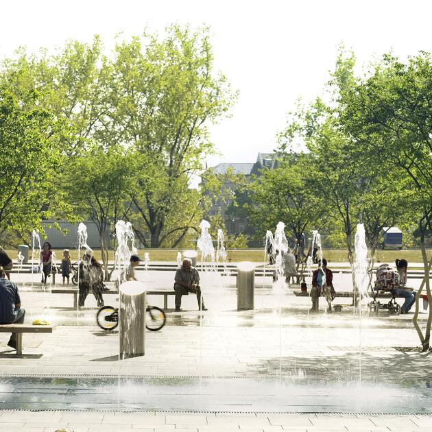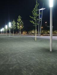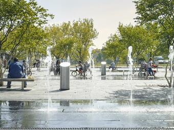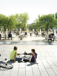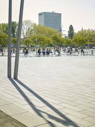 Als einer der größten Quartiersplätze Mannheims zeigt der Alte Messplatz heute die Qualität unzerschnittener, multifunktionaler innerstädtischer Freiräume auf. Durch die klare Zonierung und den „Mut zur Leere“ lässt sich rund um den Platz die Stadtsilhouette Mannheims erleben und