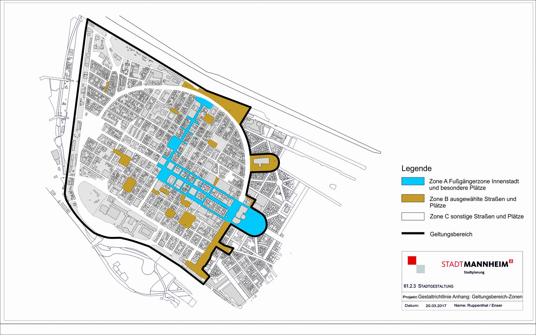 Angewendet wird die Gestaltrichtlinie innerstädtisch in dem unten gezeigten Geltungsbereich auf allen öffentlich nutzbaren Straßen, Wegen und Plätzen, die als Straßen – oder Wegeflächen öffentlich gewidmet sind oder sich mit diesen in einer baulichen und betrieblichen Einheit befinden.