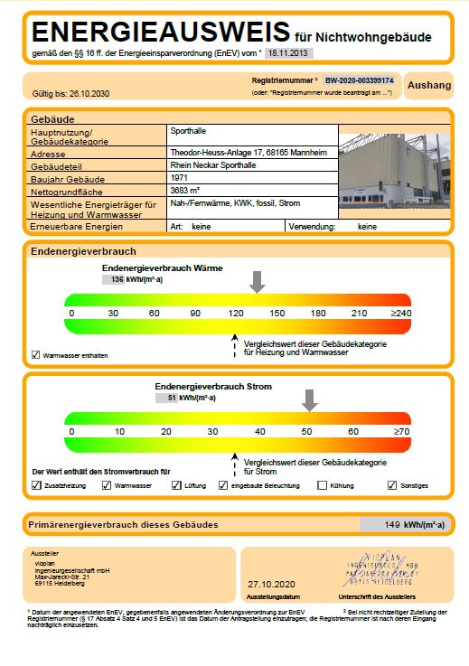 Seit dem 1. Juli 2009 besteht eine Energieausweis-Pflicht für Nichtwohngebäude. Diese Energieausweise sind seit der Verschärfung der EnEV 2014 zum Januar 2016 auch in öffentlichen Gebäuden mit erhöhtem Publikumsverkehr und mehr als 250 Quadratmetern Nutzfläche, an einer für die Öffentlichkeit gut sichtbaren Stelle, auszuhängen. Hierunter fallen z.B. Sozialämter, Arbeitsagenturen, Schulen und Kindertagesstätten. Ausgenommen von dieser Vorschrift sind Gebäude für Besichtigungszwecke wie Museen und Kulturdenkmäler.