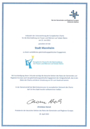 Im Jahr 2006 wurde die "Europäische Charta für die Gleichstellung von Frauen und Männern auf lokaler Ebene" (Charta) vom Rat der Gemeinden und Regionen verabschiedet. Die Charta stellt ein wirksames Instrument zur strukturellen und strategischen Implementierung einer an der Gleichstellung der Geschlechter orientierten Handlungspolitik auf kommunaler Ebene dar. Am 7. Juni 2011 hat der Gemeinderat der Stadt Mannheim einstimmig die Unterzeichnung der Charta beschlossen.