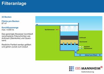 Mithilfe von aufwändigen Verfahren wird das Abwasser der Stadt Mannheim weitgehend von Schadstoffen, Nährstoffen und Spurenstoffen befreit, bevor es in den Vorfluter Rhein fließt.