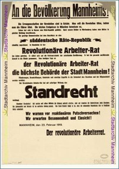 | 1918 | Ein Arbeiter- und Soldatenrat bildet sich, kann jedoch nur kurze Zeit Einfluss ausüben. Mannheim wird infolge der französischen Besetzung des linksrheinischen Gebiets Grenzstadt; der Übergang über die Rheinbrücke wird von französischem Militär kontrolliert |