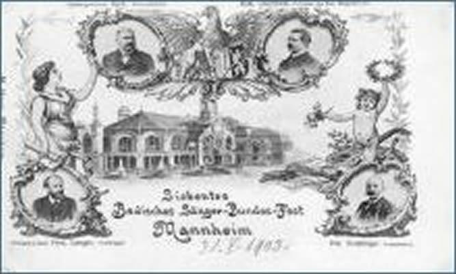 Die Festhalle Rosengarten wird eingeweiht. Nach der Zerstörung im 2. Weltkrieg wird der Gebäudeteil am Friedrichsplatz mit Musen- und Stamitzsaal wieder aufgebaut; an Stelle des Nibelungensaals wird bis 1974 ein Neubau (Mozartsaal) errichtet. Durch eine unterirdische Variohalle erhält das Kongresszentrum 1999 weitere Räume. |
