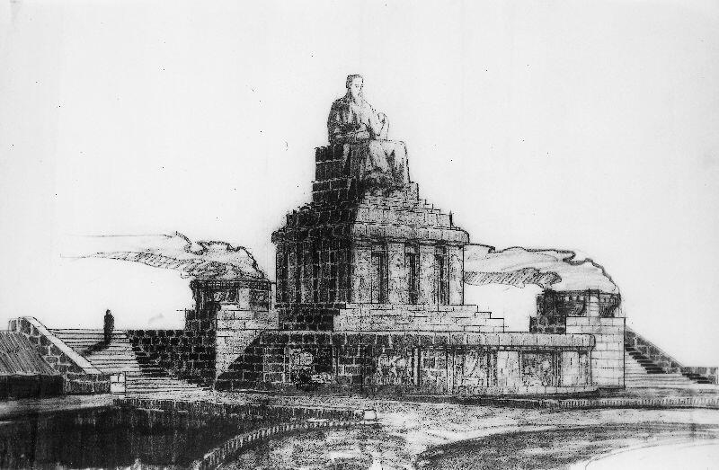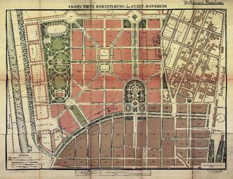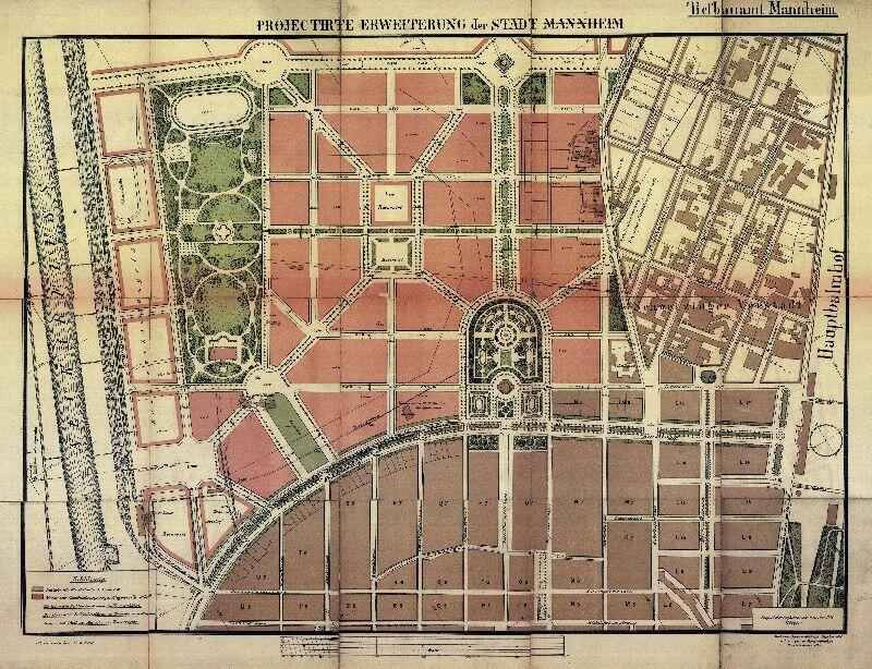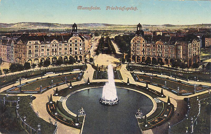 Auf den weitläufigen Flächen rund um den Wasserturm legt der Stadtgärtner in den 1890er Jahren einen Schmuckplatz an als Eingangsportal für die vornehme östliche Stadterweiterung. Das Areal wird nach 1899 gänzlich neu gestaltet. Die Pläne für die Grünanlagen und die umgebenden Arkadenbauten liefert der renommierte Berliner Architekt Bruno Schmitz (1858-1916). Dieser hatte zuvor durch den Gewinn eines Wettbewerbs auch schon den Auftrag zum Bau des Rosengartens erhalten. In dem Ensemble aus gärtnerischer Anlage, Pergola und Wasserbecken mit Kaskade und Fontäne verbindet sich Jugendstil-Ornamentik mit Elementen barocker Planung. Die Benennung des Platzes erfolgt nach dem regierenden Großherzog Friedrich I. Die später geplante Errichtung eines monumentalen Denkmals zu Ehren des 1907 verstorbenen Landesvaters vereitelt der 1. Weltkrieg ebenso wie den Bau des als Pedant zum Rosengarten auf der Südseite des Platzes vorgesehenen Museums.