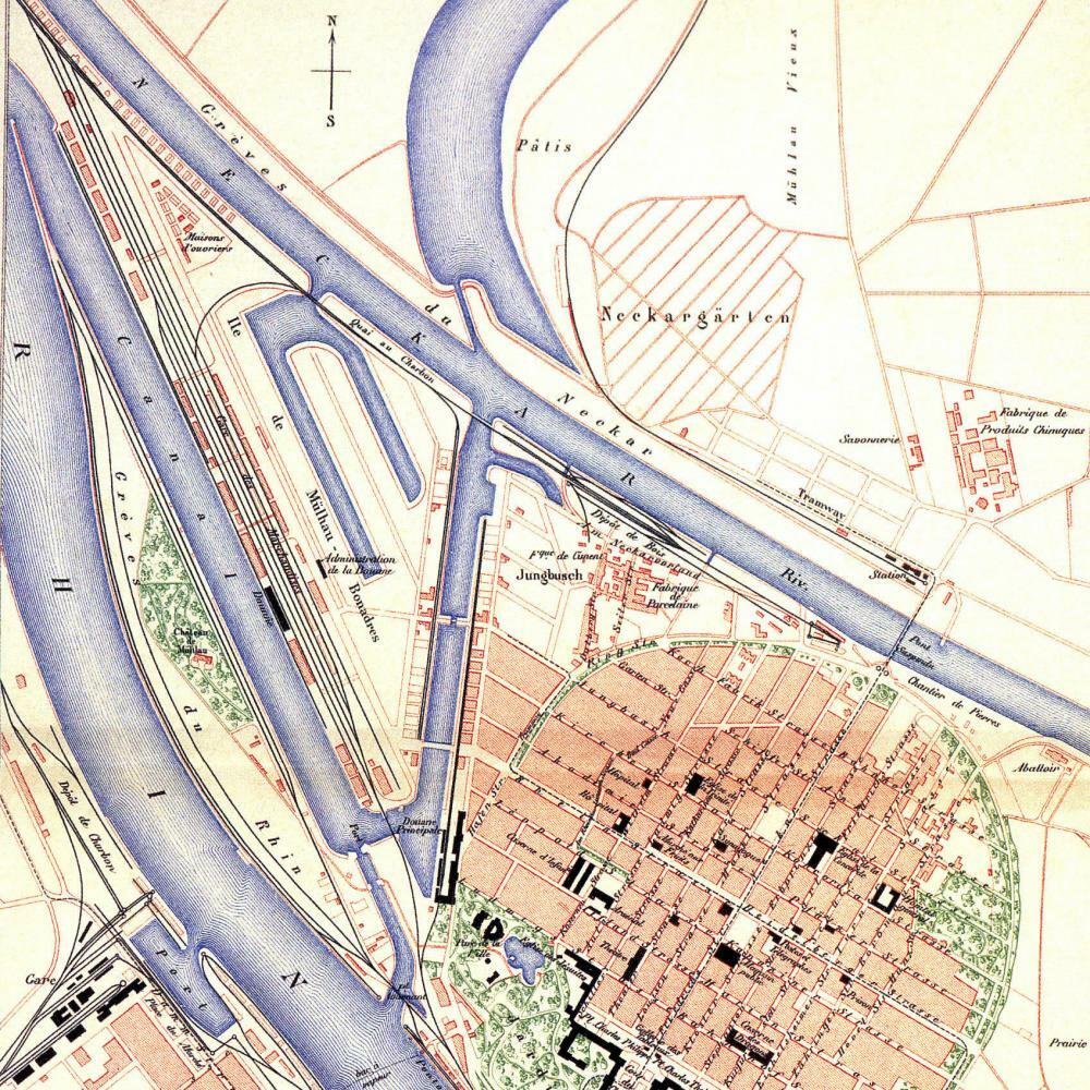 Im 19. Jahrhundert befahren immer mehr Mannheimer Schiffe den Rhein. Zuvor hatte die Neckarschifffahrt größere Bedeutung. So erhält die Stadt 1828 einen zollbegünstigten Freihafen am Rhein, eine einfache Anlegestelle unterhalb der Schiffsbrücke. Diese führt etwa auf Höhe des heutigen Haus Oberrhein über den Strom und besteht aus aneinander befestigten Nachen, über die ein Brückensteg führt. 1840 wird das erste Hafenbecken mit Zufahrt vom Rhein eröffnet. Die Bedeutung Mannheims als Handelsplatz nimmt immer mehr zu. Direkt am Hafenkopf befindet sich das „Hôtel de l’Europe“, in dem zahlreiche Rheintouristen aus ganz Europa absteigen, die per Dampfschiff die Stadt erreichen. Das Hafengebiet ist sowohl Arbeiterquartier wie standesgemäße Adresse und wird auch als „Eldorado ... am Rheinhafen“ bezeichnet. Mit der Rheinregulierung wird im letzten Drittel des 19. Jahrhunderts der Ausbau der Hafenanlagen möglich: Der Mühlauhafen und der Verbindungskanal werden neu angelegt, in den Schleifen von Alt-Neckar und Alt-Rhein entsteht um 1900 der Industriehafen.