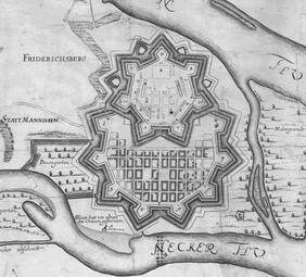 Auf dem heutigen Schlossplatz befindet sich im Mittelalter das Dorf Mannheim, eine merowingisch-fränkische Gründung, vermutlich aus der ersten Hälfte des 6. Jahrhunderts. Um 1440 leben bereits rund 500 Menschen in Mannheim, das Dorf gehört zu den größten der Kurpfalz. Wegen seiner gewachsenen Bedeutung und seiner strategischen Lage am Zusammenfluss von Rhein und Neckar will der Pfälzer Kurfürst Friedrich IV. zu Beginn des 17. Jahrhunderts hier eine starke Festung und eine Stadt als Doppelanlage gründen, um seine Vormachtstellung als Haupt der protestantischen Union zu unterstreichen. Gleichzeitig hofft er, Glaubensflüchtlingen aus Frankreich und den Niederlanden anzulocken. Deshalb bietet er den Mannheimer Dorfbewohnern den Tausch ihrer Häuser und großzügige Entschädigung ihrer Grundstücke an. Trotz erheblicher Widerstände wird am 17. März 1606 der Grundstein für die Festung Friedrichsburg und die Stadt Mannheim gelegt. Die meisten Bewohner siedeln schließlich in die am 24. Januar 1607 privilegierte Stadt um. Konzipiert hat die barocke Planstadt mit ihrem rechtwinkligen, bis heute charakteristischen Straßensystem („Quadrate“) der Niederländer Barthel Janson. Bereits wenige Jahre später, im Dreißigjährigen Krieg, werden Festung und Stadt nahezu vollständig zerstört.