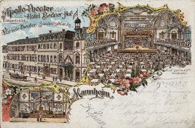 Im 18. Jahrhundert steht an dieser Stelle der „Badner Hof“, ein beliebtes Alt-Mannheimer Vergnügungslokal. Im Obergeschoss befindet sich ein Saal für Tanzveranstaltungen und Versammlungen aller Art. Im Sommergarten werden Theatervorstellungen unter freiem Himmel gegeben. Nach verschiedenen Umgestaltungen entsteht 1898 nach Plänen der Mannheimer Architekten Köchler & Karch die beliebte „Gastierbühne“ Apollo-Theater mit Restaurant. Der rund 1200 Personen fassende neobarocke Theatersaal bietet Raum für Konzerte aller Art, für Varieté-, Kabarett- und Filmvorführungen. Die Popularität des „Apollo“ liegt sicher auch in dieser Vielfalt seines Angebots begründet. 1935 wird das gesamte Quadrat G 6 im Zuge der Altstadtsanierung durch die nationalsozialistische Stadtverwaltung abgerissen und neu bebaut. Es entstehen Wohnhäuser mit Ladeneinbauten im Erdgeschoss.