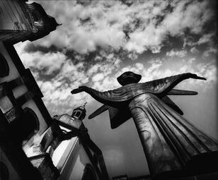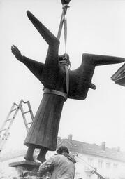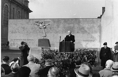 Der Friedensengel wird im städtischen Auftrag von dem Bildhauer Gerhard Marcks (1889-1981) als Mahnmal für die Toten der Jahre 1933 bis 1945 geschaffen. Der Oberbürgermeister Her-mann Heimerich (1885-1963) will damit für die Mannheimer Bevölkerung im Quadrat B 4 einen Ort öffentlicher Trauer und gemeinschaftlichen Gedenkens schaffen. Das Denkmal soll zur Ver-söhnung der in der Frage des Umgangs mit der Vergangenheit gespaltenen Nation beitragen. So knüpft auch die Einweihung am 16. November 1952 in Anwesenheit von Bundeskanzler Kon-rad Adenauer (1876-1967) an die Volkstrauertage der zwanziger Jahre an, die später von den Nationalsozialisten zu „Heldengedenktagen“ umfunktioniert wurden. Nach dem 2. Weltkrieg en-gagieren sich namhafte demokratische Kommunalpolitiker für eine Erneuerung der ursprüngli-chen Tradition. Die Plastik wird im Mai 1983 von ihrem prominenteren Standort in B 4 im Schat-ten der Jesuitenkirche nach E 6 versetzt.