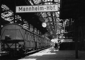 Der Mannheimer Hauptbahnhof befindet sich seit 1876 an dieser Stelle, die damals noch außerhalb des bebauten Stadtgebiets liegt . Seine Verlagerung vom Tattersall hierher hängt mit dem Bau der 1868 eröffneten festen Rheinbrücke nach Ludwigshafen zusammen, die Straßen- und Eisenbahnbrücke in einem ist. Das Bahnhofsgebäude wird mehrfach umgebaut: 1927 bis 1929 wird die Kuppel entfernt, die der „Neuen Sachlichkeit“ der 1920er Jahre nicht mehr entspricht. Bei der letzten Sanierung des Hauptbahnhofs am Anfang des 21. Jahrhunderts entsteht sie als Glaskuppel neu. Als Bahnknotenpunkt, den er bis heute darstellt, ist der Mannheimer Hauptbahnhof nicht nur in Friedenszeiten ein Tor in alle Welt mit direkten Verbindungen nach Paris, Basel oder Berlin und Hamburg. Im 1. Weltkrieg machen die Züge mit Soldaten für den Stellungskrieg in Frankreich hier Halt ebenso wie die Lazarettzüge mit den dort Verwundeten. Im 2. Weltkrieg werden sowohl die Deportation der badischen Juden nach Gurs 1940 mit der Bahn durchgeführt als auch 1942 deren weitere Verschleppung, die über das Sammellager Drancy bei Paris in die Vernichtungslager im Osten führt. Die Züge aus Drancy passieren auch den Mannheimer Hauptbahnhof.