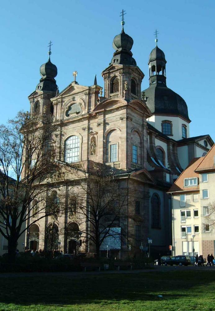 Die Jesuitenkirche ist das herausragende bauliche Zeugnis für den Übergang der pfälzischen Kurwürde an eine katholische Linie des Hauses Wittelsbach. 1727 vermacht Kurfürst Karl Philipp dem Jesuitenorden ein Bauareal an der Westseite des Schlosses. Wenige Jahre später beginnen die Arbeiten an der „Großen Hofkirche“, der Grundstein wird 1733 gelegt. Der Bau nach Plänen von Allessandro Galli da Bibiena bildet zusammen mit dem Jesuitenkolleg einen monumentalen Gebäudekomplex, der dem Selbstbewusstsein des Ordens in der protestantisch dominierten Kurpfalz Ausdruck verleiht. Der erst Gottesdienst findet 1756 statt. Nach der Aufhebung des Jesuitenordens 1773 wird die Jesuitenkirche ab 1804 als katholische Stadtpfarrkirche genutzt. Das Gebäude wird im 2. Weltkrieg stark zerstört und in den folgenden Jahrzehnten wieder aufgebaut. Die Rekonstruktion des Hochaltars wird 1997 abgeschlossen, weitere Renovierungsarbeiten folgen.