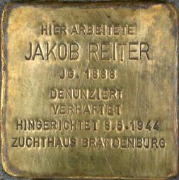 Jakob Reiter war vielen Mannheimern als Brezelverkäufer in der Vorhalle der AOK bekannt. In einem Gespräch mit dem dortigen Pförtner äußerte er sich über die Vernichtung der Juden und wurde vom Betriebsobmann der AOK bei der Gestapo denunziert. Diese konstruierte aus den Beschuldigungen eine das Todesurteil geradezu herausfordernde Anklage, das der Volksgerichtshof Berlin am 29. März 1944 erwartungsgemäß verkündete. Am 8. Mai 1944 wurde dieser Spruch in Brandenburg a. d. Havel vollstreckt.