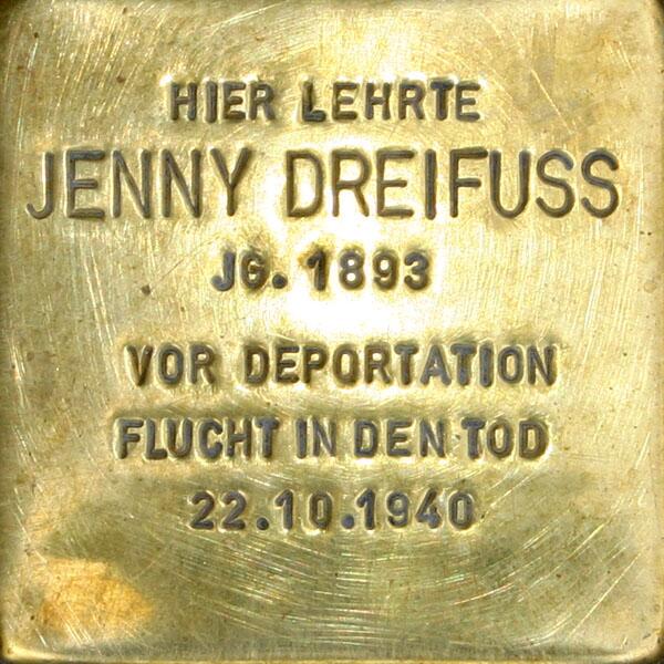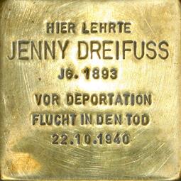 Die im südbadischen Nonnenweier am 26. Juni 1893 geborene Lehrerin Jenny Dreifuß zog 1924 von Bruchsal nach Mannheim, wo sie an der Elisabethschule als Lehrerin für Deutsch, Englisch und Französisch tätig war. 1933 wurde sie nach den Bestimmungen des sogenannten „Gesetzes zur Wiederherstellung des Berufsbeamtentums“ als Jüdin vorzeitig in den Ruhestand versetzt. Nachdem 1934 auch in Mannheim jüdische Sonderklassen und eine jüdische Schule eingerichtet wurden, wurde Jenny Dreifuß Lehrerin an der Jüdischen Schule in K 2. Am 22. Oktober 1940 war auch sie zur Deportation nach Gurs vorgesehen, entzog sich jedoch durch Selbsttötung, indem sie den Gashahn öffnete.