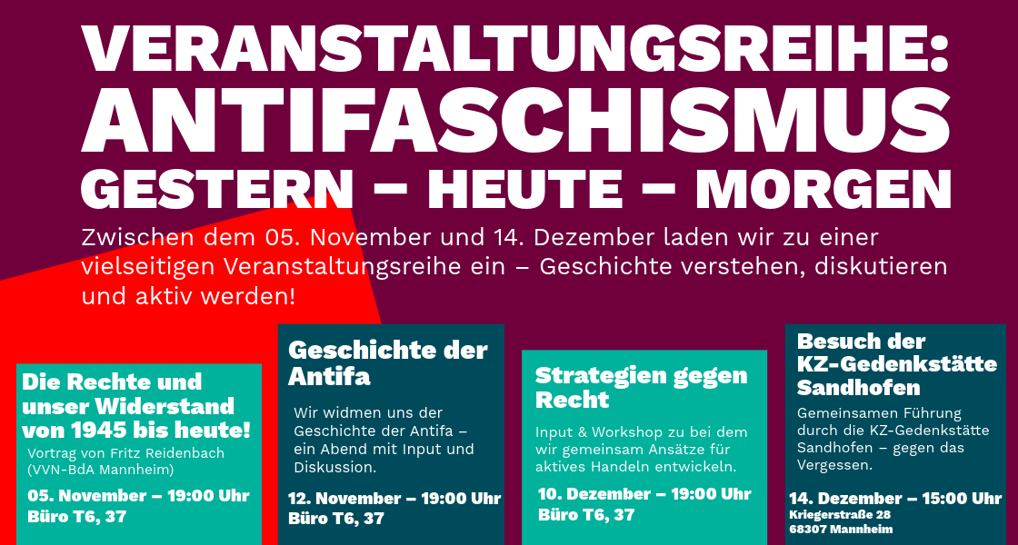 Die Linke Mannheim lädt ein: zwischen dem 05. November und dem 14. Dezember laden wir zu einer vielseitigen Veranstaltungsreihe ein: Geschichte verstehen, diskutieren und aktiv werden!