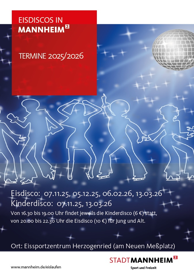 Die Kinderdiscos am 7. November 2025 und 13. März 2026 finden jeweils von 16.30 bis 19 Uhr in der roten Halle für alle eislaufbegeisterten Grundschüler mit Aufsichtsperson statt. Der Online-Verkauf zu den ersten Eisdiscos ist bereits gestartet. Tickets und weitere Informationen unter: https://www.mannheim.de/de/service-bieten/sport/eislaufen