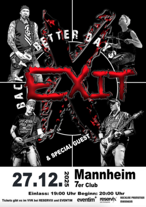 Exit X spielen nicht nur die „üblichen Verdächtigen“ sondern ausgesuchte Highlights und Evergreens, egal ob bekannt oder nicht und begeistern damit Fansund Szenekenner. Aktielles Repertoire: Exit X, Foo Fighters, AC/DC, Guns ‚n‘ Roses, 3 Doors Down, CCR, Glorious Sons, Badflower, Jimmy Eat World, Gaslight Anthem, Motörhead, Beastie Boys, Billy Idol, Bon Jovi, Neil Young, Collective Soul, Poison, Metallica, The Sweet, Kiss, Twisted Sister, Ugly Kid Joe, Kid Rock, Greenday und einigen Überraschungen mehr mit denen Ihr nicht rechnet – Expect the unexpected