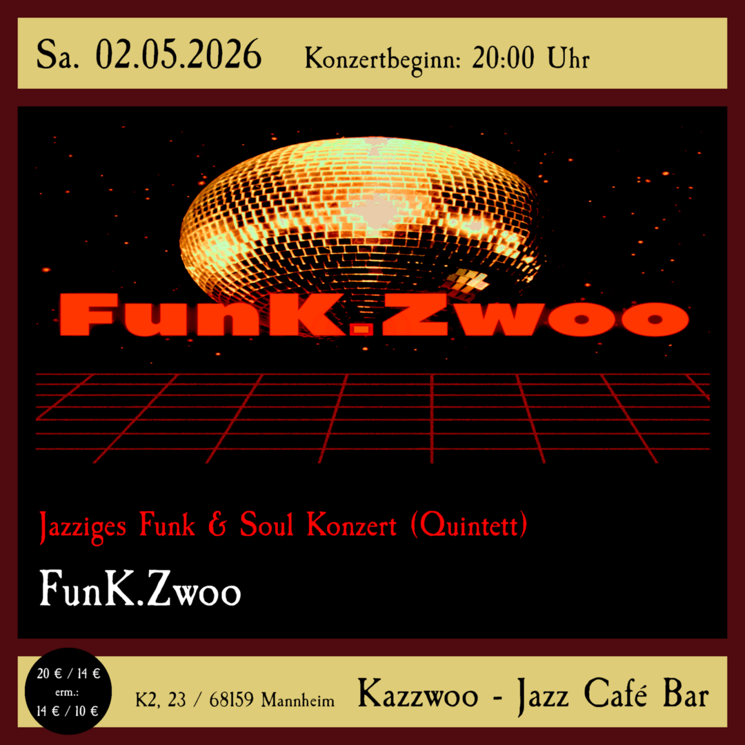 Unsere monatliche Konzertreihe. FunK.Zwoo verspricht einen unvergesslichen Abend voller mitreißender Beats und ausgelassener Stimmung. Freut euch auf groovige Vibes, inspiriert von den Legenden des Genres wie James Brown, Chaka Khan, Stevie Wonder und Kool & The Gang. Kommt vorbei, tanzt, lacht und feiert mit uns – es wird funky!