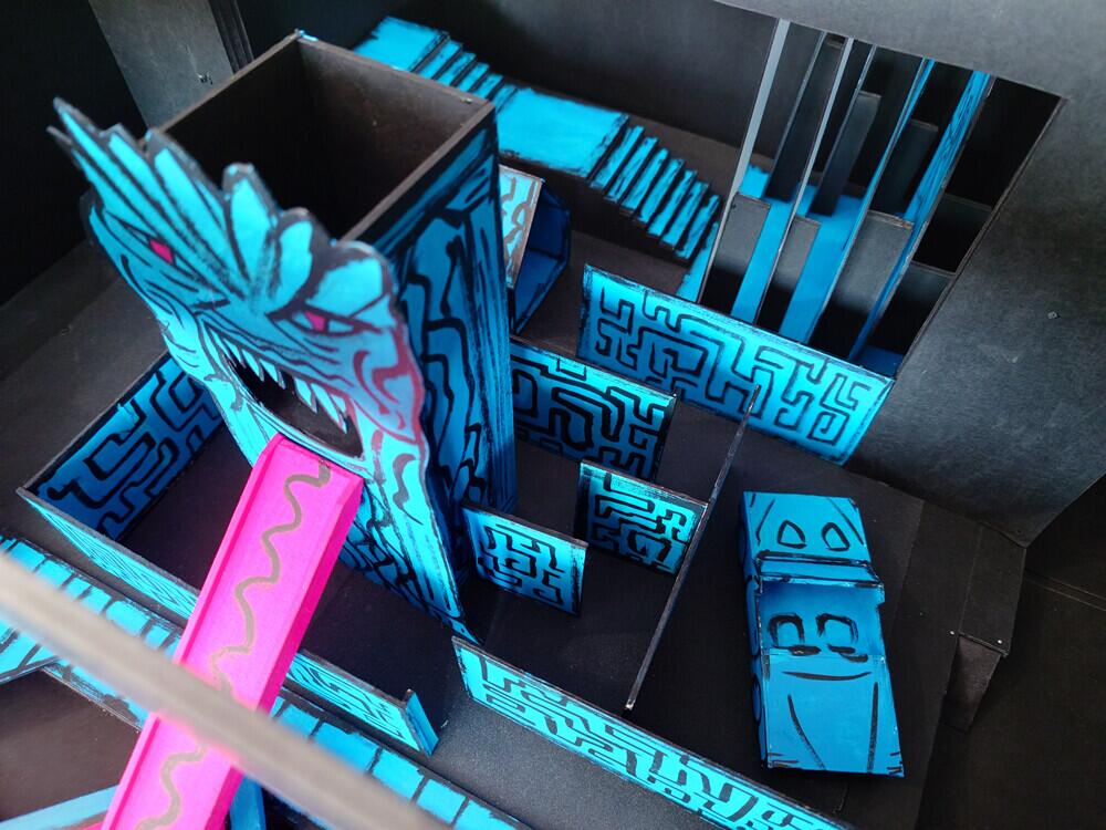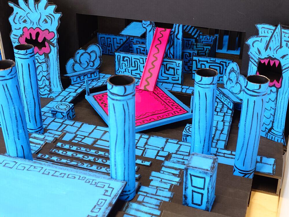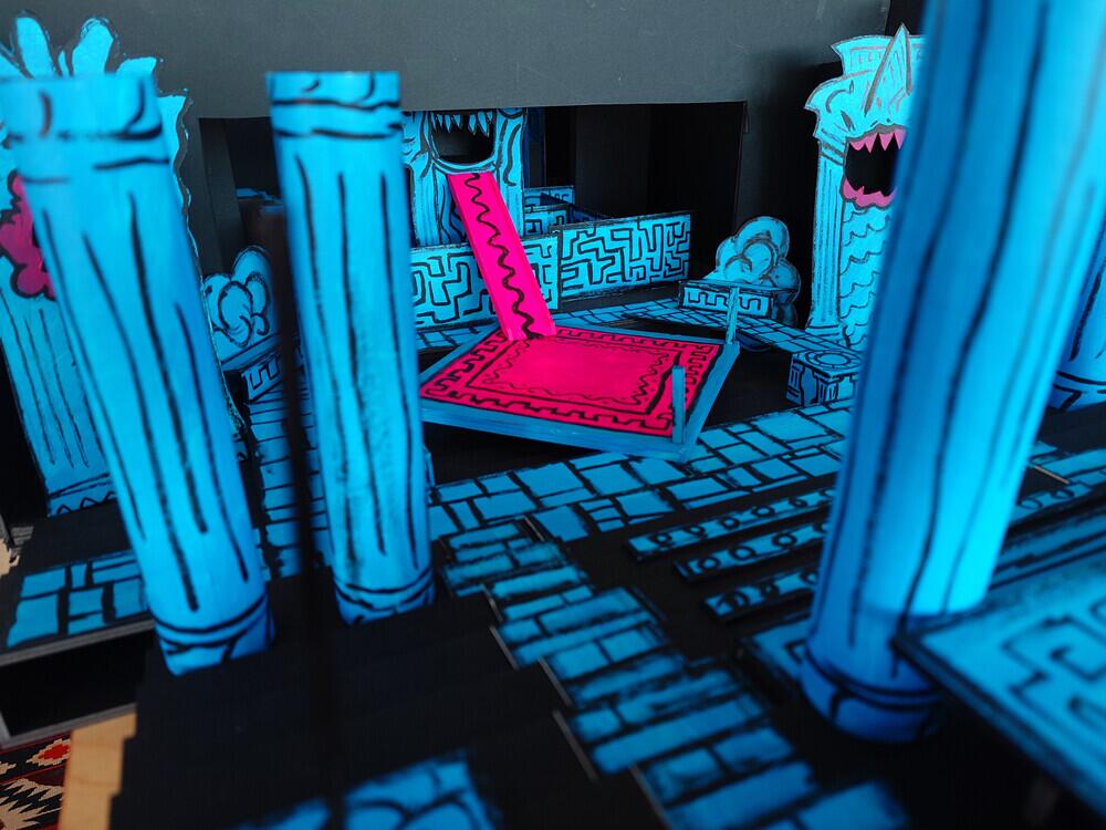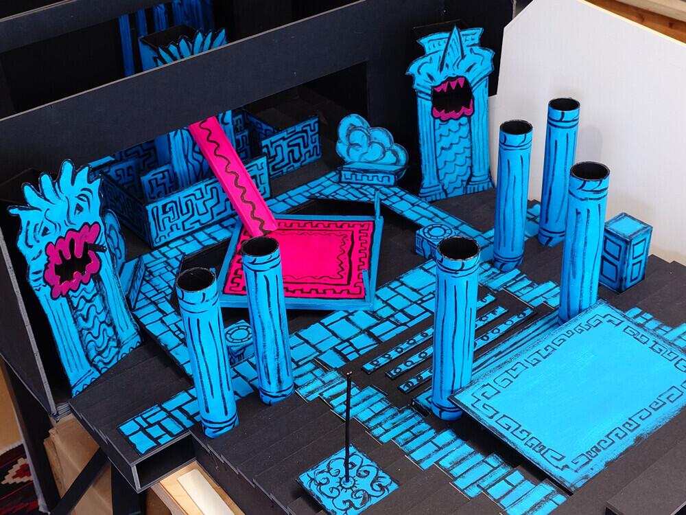 Für die dreiwöchige Bespielung des Alten Kino Franklins entwirft Bühnenbildner Alexander Naumann eine cyan- und magenta-farbige Kunstwelt, die die Trennung zwischen Zuschauerraum und Bühne aufhebt. Titanen, Gött*innen und Held*innen tragen ihre tragischen Konflikte in verschiedenen Szenerien aus – mit Maske und Kothurn, im geparkten Auto oder in einem Wrestling-Ring.