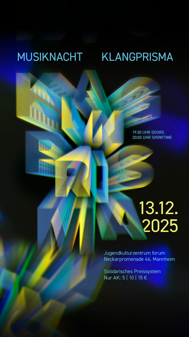 Die Musiknacht Klangprisma bringt die Musikstadt Mannheim einen Abend lang zum Schwingen! Gemeinsam mit dem Kulturamt der Stadt Mannheim verwandelt das Jugendkulturzentrum forum seine Räumlichkeiten in einen pulsierenden Musikclub und zeigt, was in der Mannheimer Musikszene steckt! Bunt leuchtend fügt sich ein Mosaik aus Melodien, vollen Sounds, schwebenden Klängen, Grooves, Begegnung und Energie zusammen – ein Spotlight für lokale Musiker*innen, das einmal mehr beweist, wie vielfältig, leidenschaftlich und kreativ diese Stadt klingt! Klangprisma Mannheim ist mehr als eine Musiknacht: es ist ein Statement für eine lebendige Musikkultur und für kulturelle Begegnungsorte, an denen Musik gelebt und geliebt wird! Höre den Sound und fühle den Puls unserer Stadt – das Prisma erklingt!