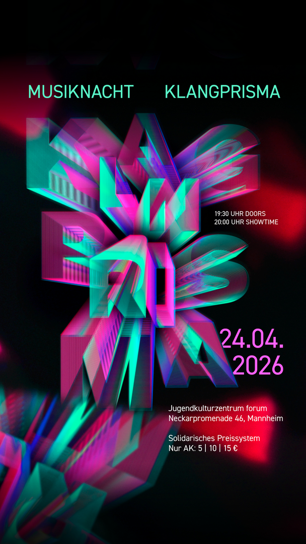 Nach dem erfolgreichen Start im Jahr 2025 möchte das Kulturamt mit der Kooperation Klangprisma auch in der aktuellen Ausgabe zwei Ziele erreichen: Zum einen sollen die Räume des Jugendkulturzentrums forum als wichtiger Musikclub in Mannheim stärker sichtbar gemacht werden. Zum anderen soll die vielfältige und hochkarätige Mannheimer Musikszene präsentiert werden.
